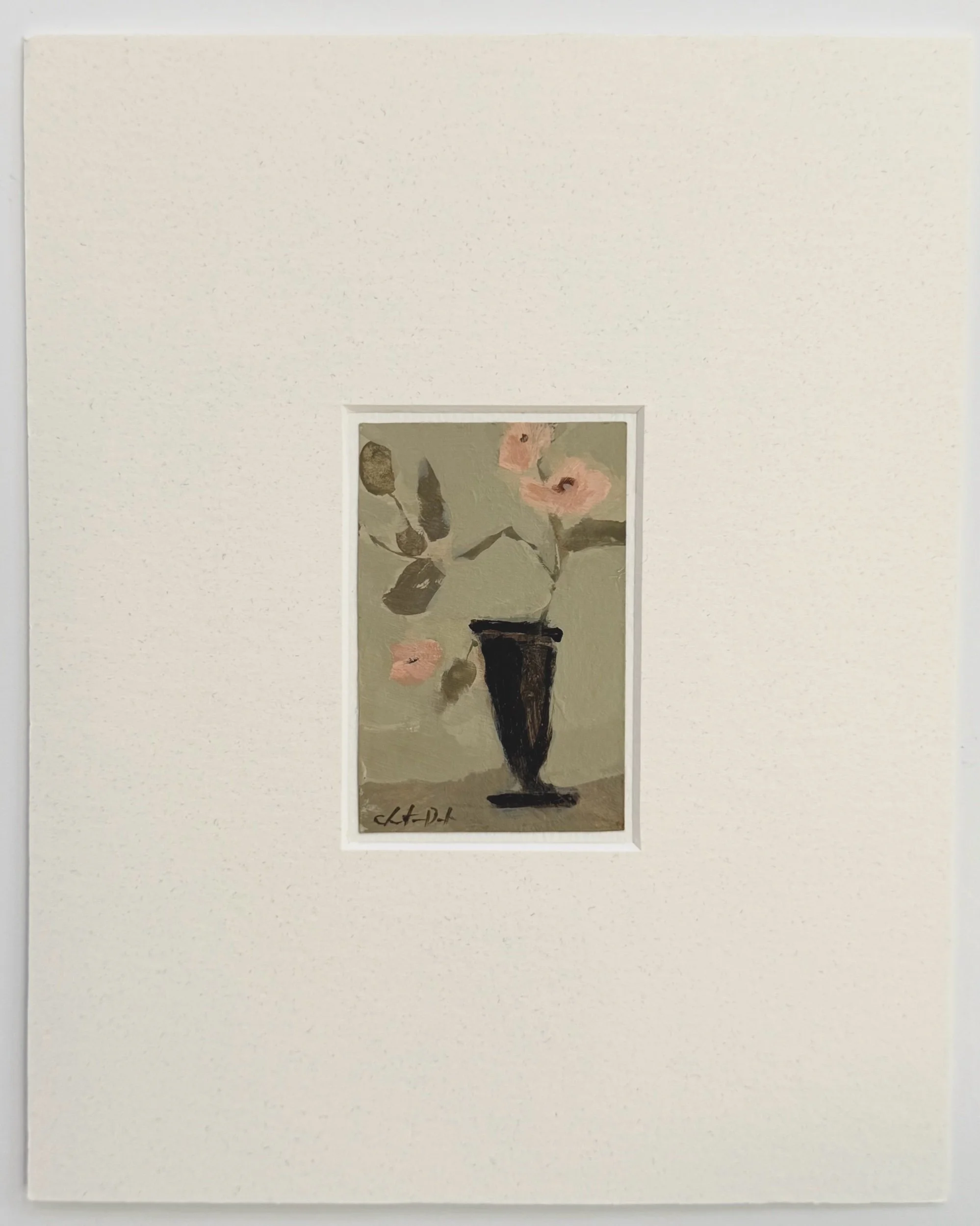 Mini 3” Original, acrylic on paper in a 10”x8” mat. Colors are warm, muted olive and muted peach flowers. Art size is 3”x2.5” Shipping is included in price.
